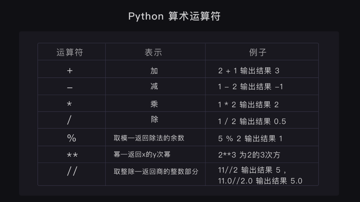 在说浮点数之前,各位可以看下 Python 的算术运算符有哪些,有个印象。