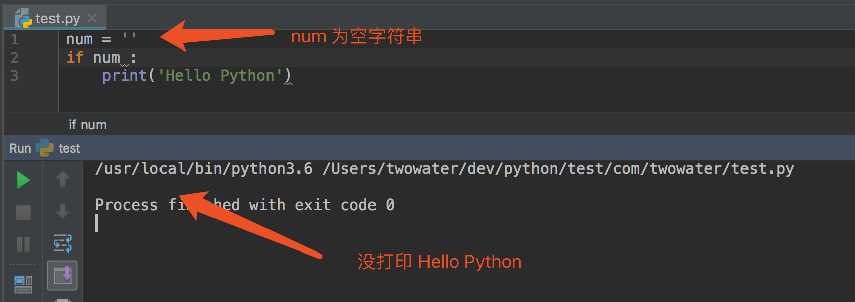很明显,空字符串是为 False 的,不符合条件语句,因此不会执行到 print('Hello Python') 这段代码。
