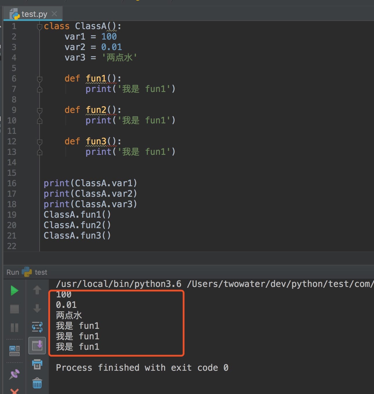 你看,上面我们就定义了一个类,类名叫做 ClassA , 类里面的变量我们称之为属性,那么就是这个类里面有 3 个属性,分别是 var1 , var2 和 var3 。除此之外,类里面还有 3 个类方法 fun1() , fun2() 和 fun3() 。